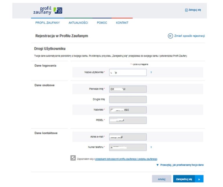 - Zostaniesz ponownie przekierowany na stronę Profilu Zaufanego („Rejestracja w Profilu Zaufanym”)