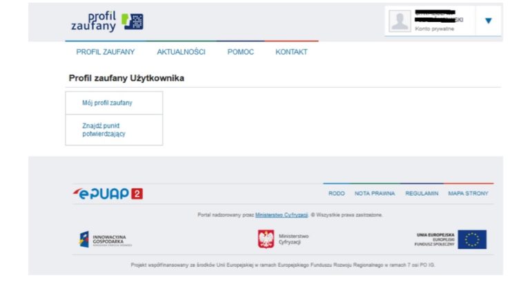 - Po zatwierdzeniu ponownie trafisz na stronę Profilu Zaufanego („Profil zaufany Użytkownika”). W prawym górnym rogu powinno pojawić się imię i nazwisko zalogowanego użytkownika.
